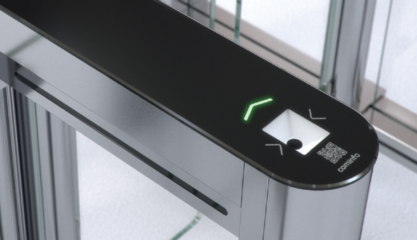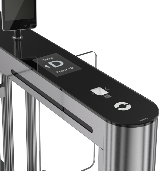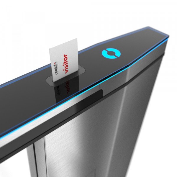 QR/svītrkoda lasītājs ir integrēts piekļuves kontroles risinājuma priekšējā panelī vai priekšējā kolonnā. Izgaismots no apakšas, tas norāda lietotājiem, kur novietot karti, biļeti vai tālruni.